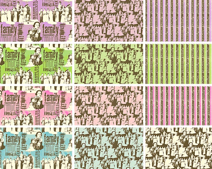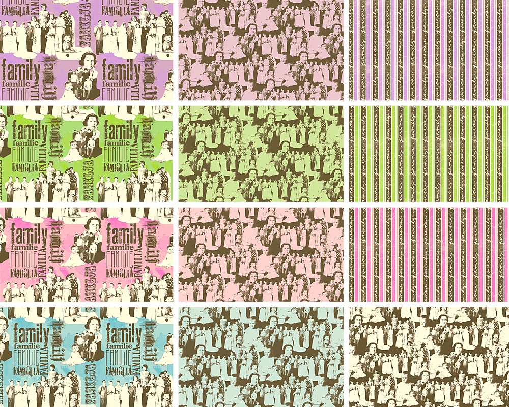 TH: They are definitely my family and GREAT North Dakota stock! I have piles of pictures of my ancestors and have always been enamored of black and white and sepia photos. It’s certainly not practical to frame and hang up every old photo I love (I don’t have that much wall space!), yet I still wanted a unique way to preserve the images in my work. So, I looked through my collection and picked out a group of favorites. Then I got to work scanning and Photoshopping to kind of posterize them. As a calligrapher, I love to find fun fonts, especially ones with a vintage, grungy feel. I translated the word “family” into several languages, and combined these words with my posterized family images to produce the final product. Now I’m figuring out all the ways I’m going to use these Family fabrics. I think some of it is going to become inserts for an old changing screen.