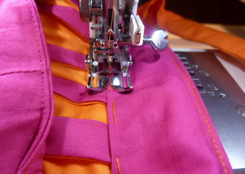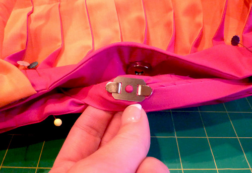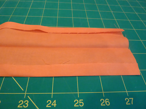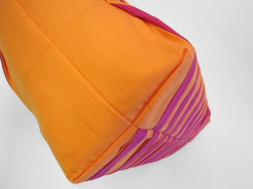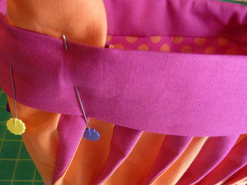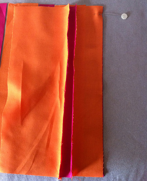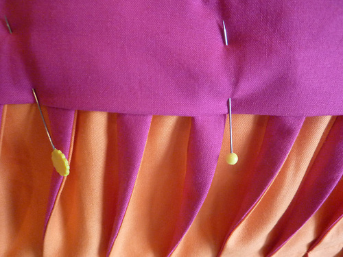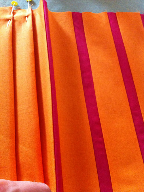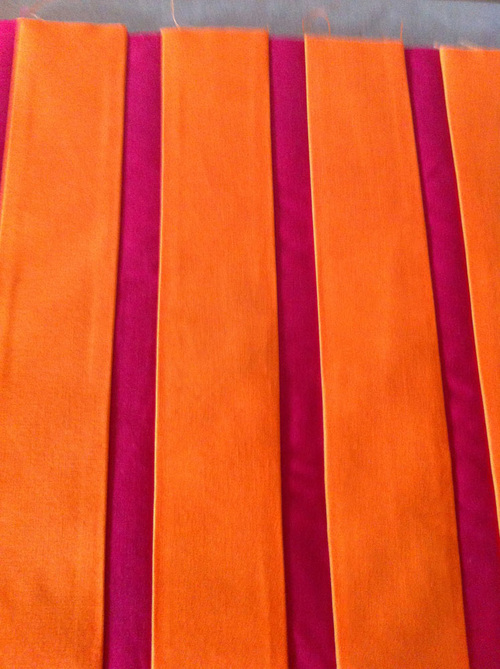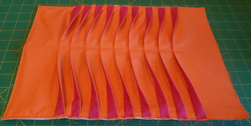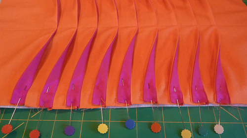 - Pinch and fold along each Tangerine/Fuchsia seam to create a pleat.