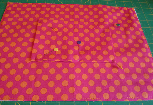 - Pin the pocket in place on one 10″ x 14″ lining piece. The pocket should be centered side to side (3½” from each edge), 2½” from the top and 3″ from the bottom.