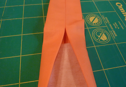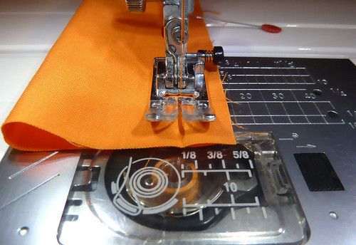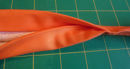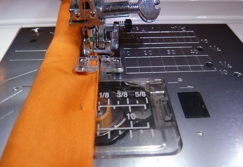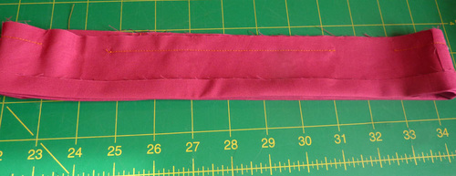 - Using a contrasting thread (we used Tangerine), topstitch along both the top and the bottom of the band.