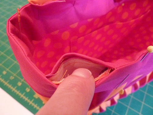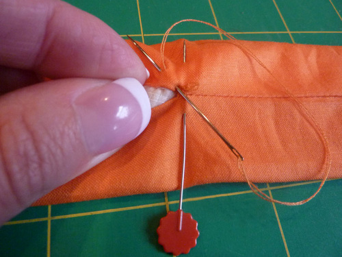 - Repeat to secure the opposite end of the cord in the same manner. Make sure the cord lays flat prior to hand-tacking the second end. You have a 15″ opening and a 16″ length of cord, so by slipping each end of the corded into the sewn ends of the seam by ½”, the remaining cord should lay nice and flat across the opening.