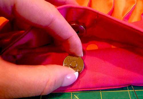 - Find the center front and center back of the bag. Insert one side of the magnetic purse clasp at each of these points, centering the clasp top to bottom within the inside accent band.