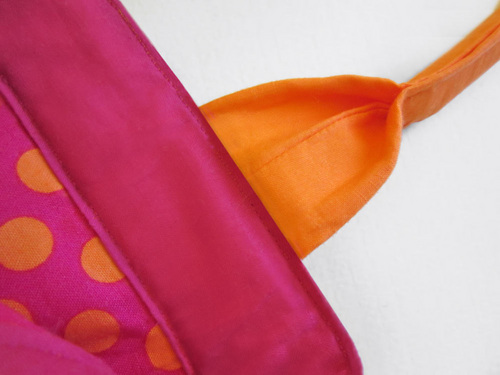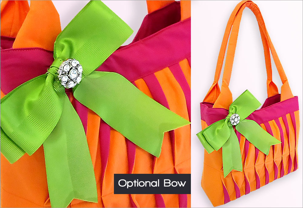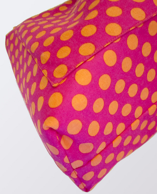 Our original bold solid colors come from Michael Miller Fabric’s Cotton Couture collection. We started with the perfect preppy combo of bright orange and hot pink… or in Cotton Couture language: Tangerine and Fuchsia. Then, we paired these solids with one of the popular Michael Miller Ta-Dot prints for the whimsical lining. And, added an optional chartreuse bow as the final touch.