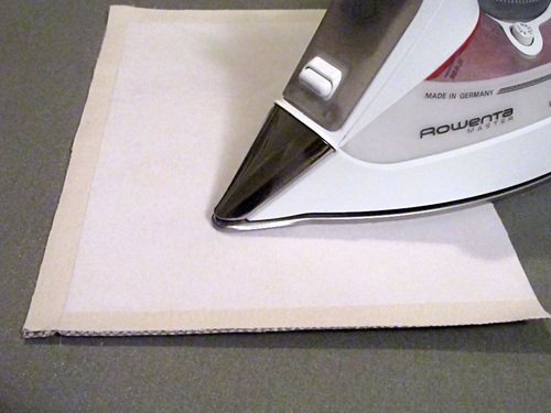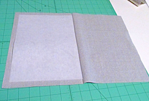 - Center the interfacing on one half of the pocket panel. It should be positioned so one edge is aligned with the center crease. There should then be ½” of fabric showing beyond the interfacing on the remaining three sides. Following manufacturer’s instructions, fuse in place.