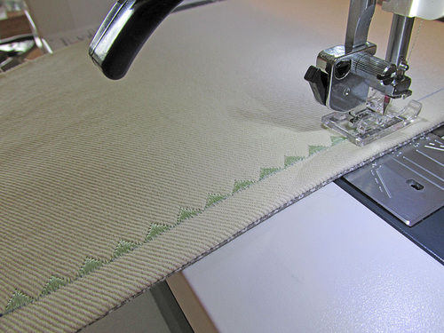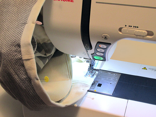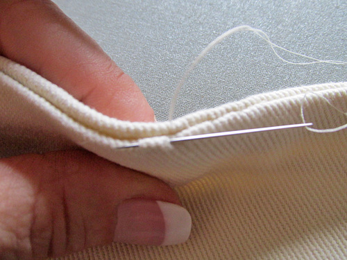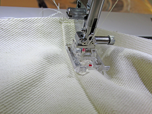 - Re-thread the machine with thread to match the exterior fabric in the top and bobbin, and edgestitch all these folded ends in place.
