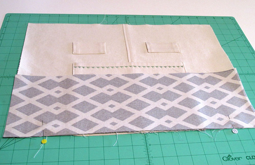 - Place the pocket right side up on one exterior panel. The pocket should be centered side to side (4½” in from each raw side edge of the exterior panel) and the raw bottom each edge of the pocket should be flush with the raw bottom edge of the exterior panel. Pin the pocket in place along both sides.