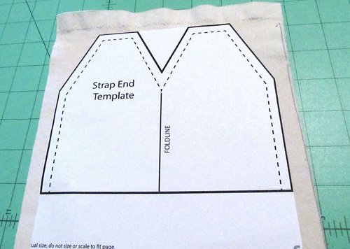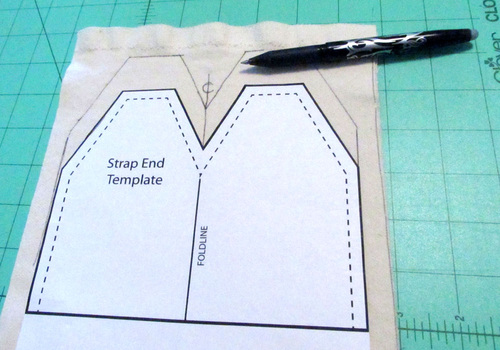 - Using a fabric pen or pencil, trace around the template at BOTH ends of the strap. And, using the template as a guide, draw in the center fold line. In the photo below, we slid down the template to show our tracing lines.