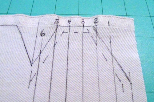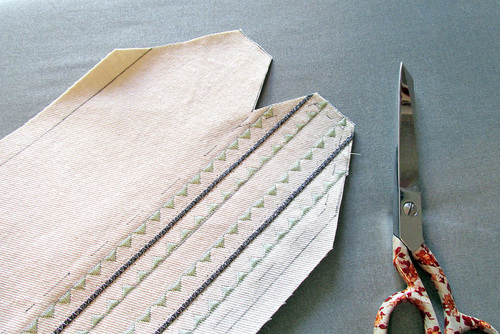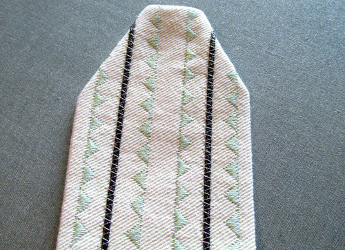 - Next, stitch embellishment line #6, which has the triangles pointing in the same direction as line #3. Following the drawn line, stitch from top to bottom.
