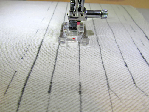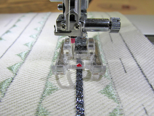 - You don’t need to pin the cording in place; you can simply hold it with your finger, centering it over the drawn line. Just go slowly and stop (with the needle in the down position) to re-adjust as necessary. Stitch down the cording from top to bottom.