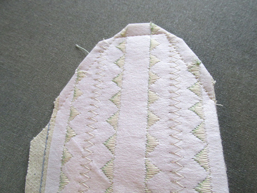 - We started with embellishment line #3, orienting the stitch so the point of the triangle is aiming toward the center of the strap. Following the drawn line, stitch from top to bottom.