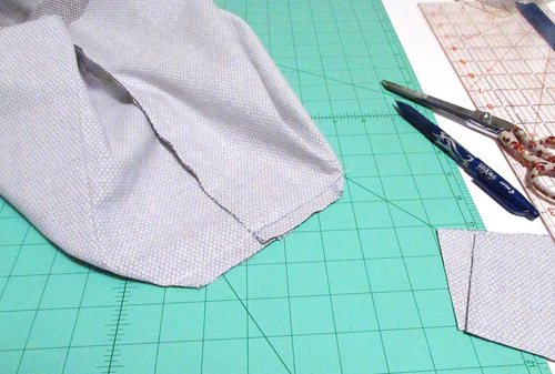 - Trim the corners diagonally and turn the pocket right side out. Push out the corners so they are nice and sharp. A long, blunt end tool, like a knitting needle or chopstick, works well for this. Press flat.