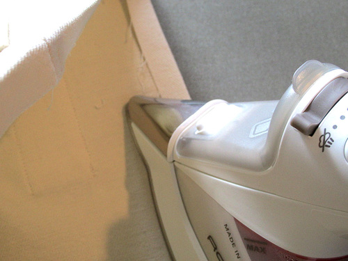 - Find the exterior bag. It should still be right side out. Fold down the top raw edge ½” all around and press.