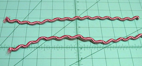 - Re-thread the machine to coordinate with the cord. We used a metallic silver in the top and quality bobbin thread in the bobbin. We set our zig zig at a width of 6.0 and a length of 2.5. Test on a scrap to insure your width and length with work with your chosen cord. The swing of the zig zig should hit just outside the cord.