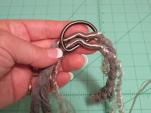 - Slip the two unraveled lengths through the D-ring. Center the cords so their wrapped centers are sitting against the middle of the flat side of the D-ring.