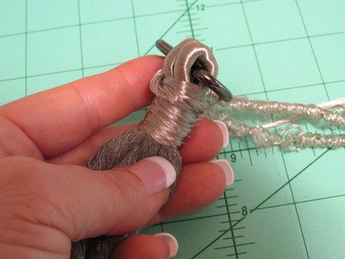 - Wrap this strand around and around the bundled cord to form the “neck” of the tassel. Your wrap should be about ¾” deep.