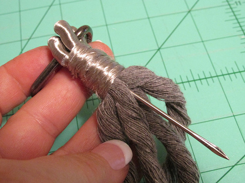 - Thread the tail of the strand through a large-eyed upholstery needle and pass the needle through the center of the “neck” of the tassel.
