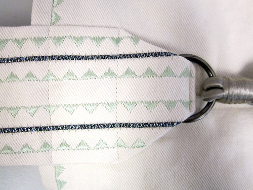 We added four lines of mirror-imaged decorative stitches down the length of the strap along with an embellished flat cord, which is stitched in place with a wide zig zag – a modern spin on a traditional heirloom technique.