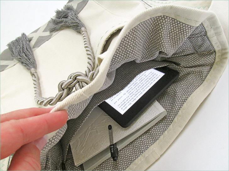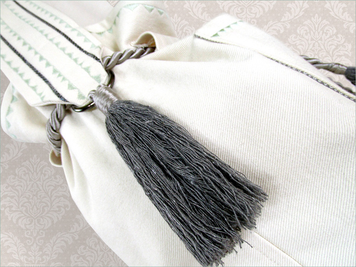 Our pretty custom tassels hang luxuriously from the bag’s side and sprout directly from the ends of twisted cord belt. If you’ve ever shopped for tassels, you know they can be hard to find in the color you want, and even if you do luck out and locate one to your liking, the price may surprise you. A single, small tassel can run $5.00 and up. We came up with an innovative way to unwrap twisted cording then sculpt it into perfectly-matched tassels.