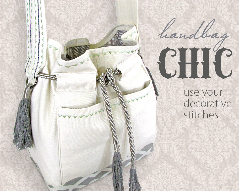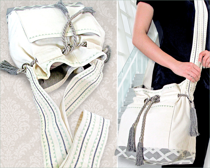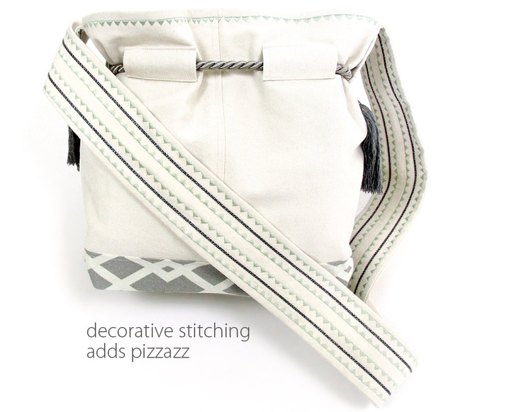 Decorative stitching against a neutral canvas gives this slouchy bucket bag a great hipster style. We used the beautiful stitches available on our Janome studio machines, many of which go up to 9mm in width. For a subtle boho flair, we then incorporated long, soft tassels at the sides and front. Read on to learn our unique steps for making these custom tassels: much less expensive than buying, and in an exact color match!