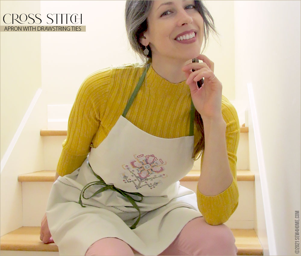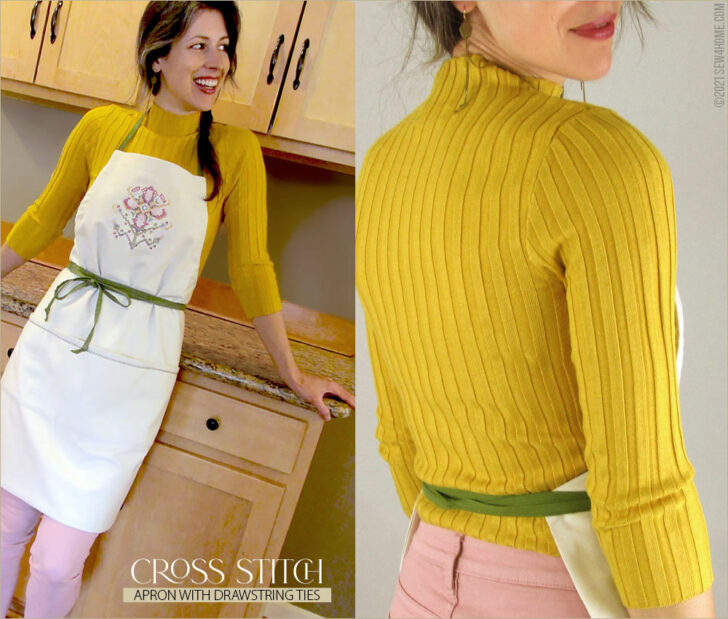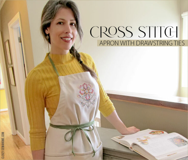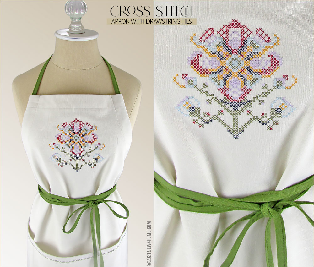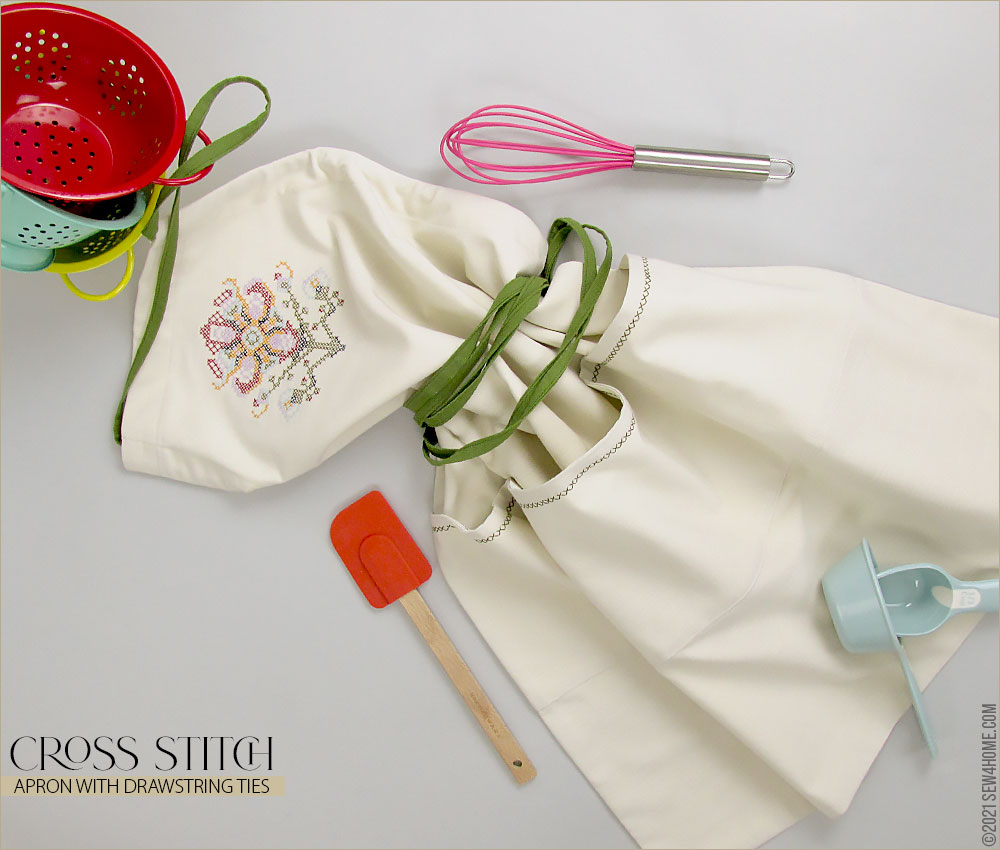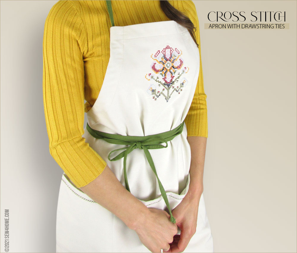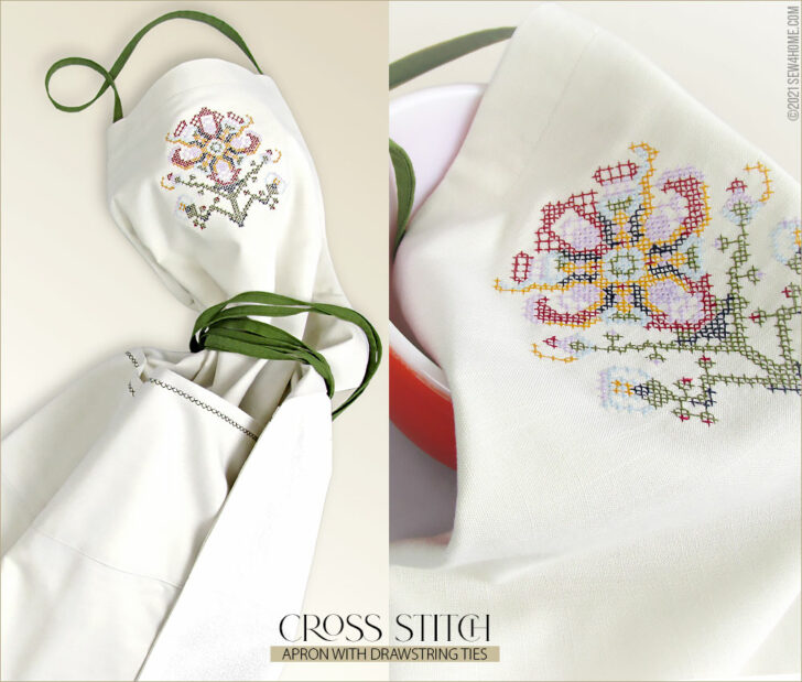 Start with a neutral solid, add a few special details, and in no time you can whip up a gorgeous chef-style apron for yourself or to give as a gift. Its classic one-piece cut is a great style for most body types. And the intricate cross stitch flower on the bib is done with a built-in machine embroidery design! So easy yet so beautiful.