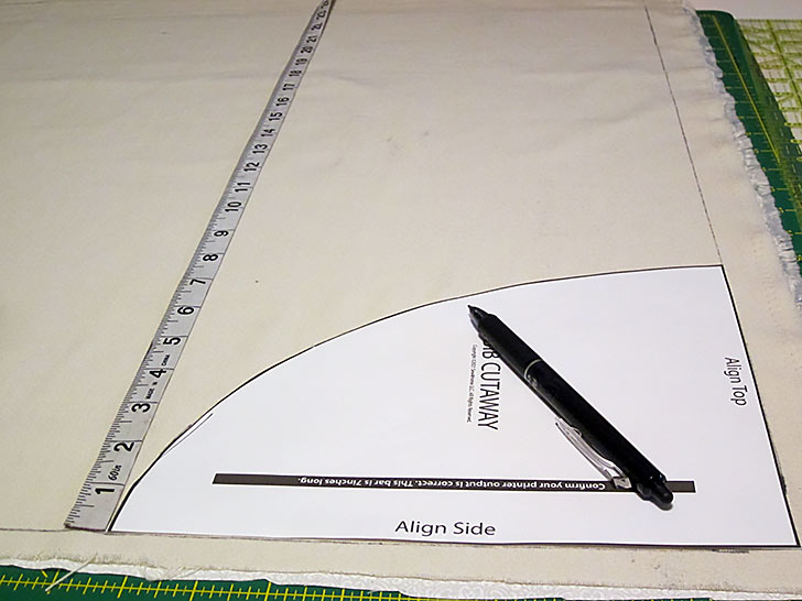 - Find the Bib Cutaway pattern. Place it in the upper corner, aligning the pattern with the top and side raw edges. Pin in place and trace the curve of the cut out with a fabric pen or pencil.