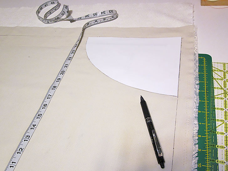 NOTE: You can see in our photo above that we chose to first trace our 26” x 32” rectangle rather than cutting to size. This is totally optional – we often do it when confirming pattern sizing. When using a cut rectangle, as stated above, simply align the pattern with the top and side raw edges of the cut panel. - DO NOT CUT along the drawn pattern curve yet.