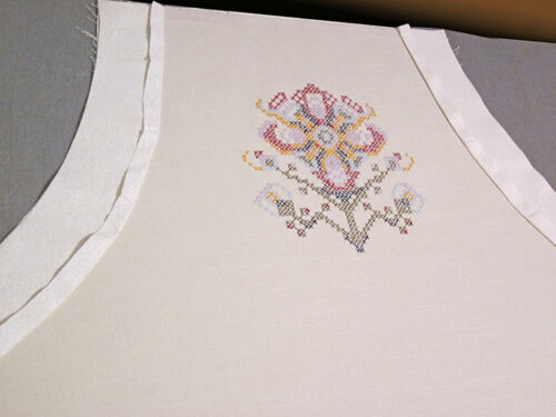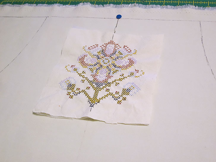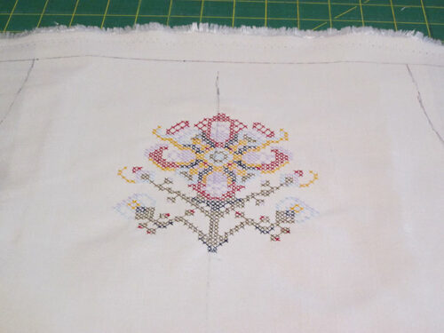 - Place the test stitch-out on the apron panel, centering it side to side between the drawn armhole curves. Our enlarged cross stitch flower was positioned so the very top-most point of the design’s center line was approximately 2½” down from the top raw edge of the panel. Mark the center line of the design as well as the top-most and bottom-most points of the design.