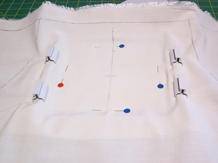 NOTE: Many Janome models have a Baste function that can be used instead of pins. We opted for pins due the loose weave of the linen. - Find the test stitch-out once more to confirm the position of the apron panel. You can see in the photo below that we measured and clipped center notches at the top, bottom, and sides of our test stitch-out to make this centering even easier.