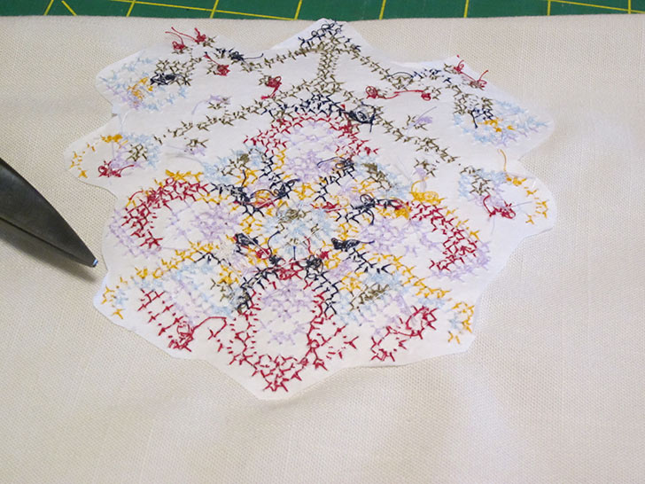 - On the wrong side, trim away the excess stabilizer close to the design.