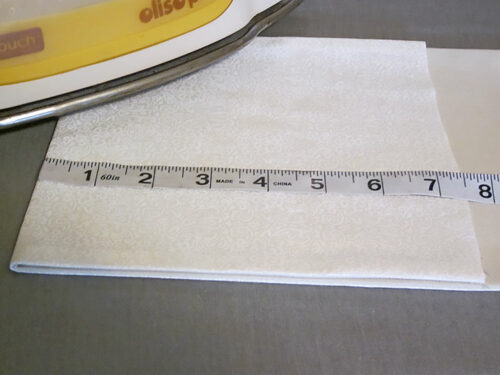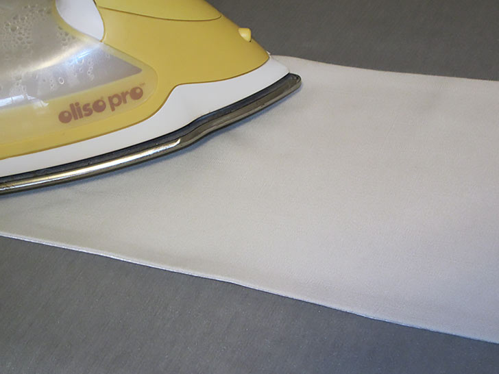 - Open up the tie, wrong side up, so the crease line is visible. Fold in each long raw edge ¼” and press well.