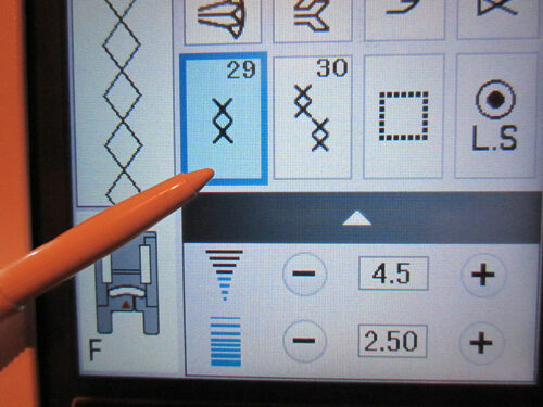 - Select a decorative stitch for the top of the pocket. On our Janome Skyline S9, we selected stitch #29 from within the Heirloom Decorative Stitch collection.