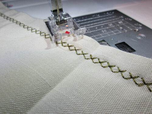 - Attach a Satin Stitch foot or similar and stitch across the pocket’s top edge.
