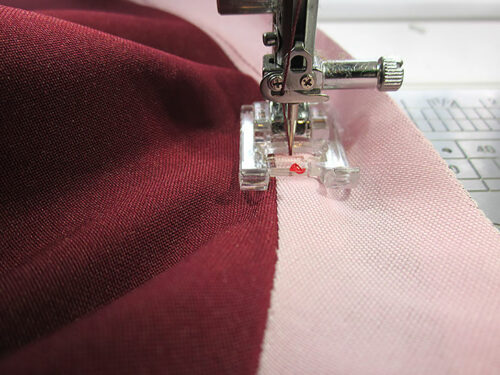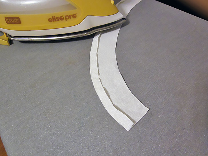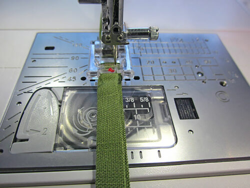 NOTE: It is easier to stitch evenly if the strip feeds into the center of the presser foot. Move the needle as far to the right as needed to sew along the folded edges.