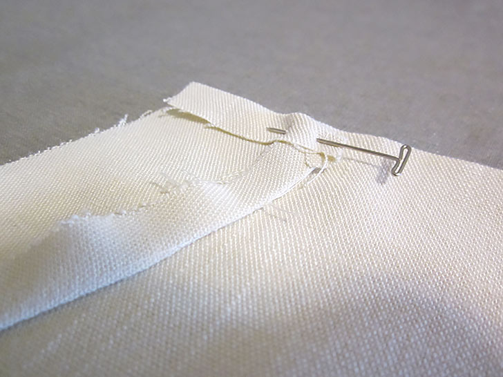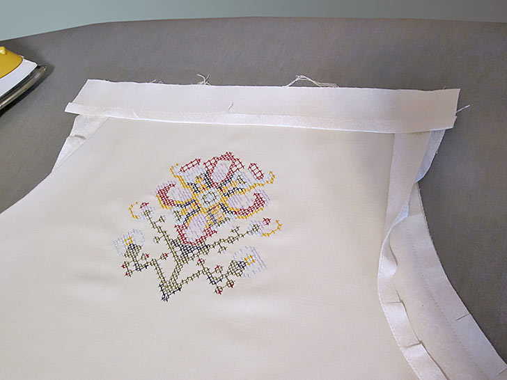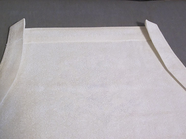 - Place the raw 13” edge of the facing across the top of the apron panel. In order for the facing to fit side by side, as shown in the photo below, the armhole facings must be folded all the way out, including their tiny ¼” hems. Pin across the top.
