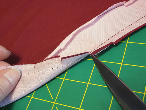 NOTE: The next four images were done as a prototype in bolder colors in order to better show the clipping and understitching steps. Our exterior and lining fabrics were so similar in tone, it was hard to tell what was going on. In these shots, the burgundy is the apron exterior and the pink is the apron lining. - Generously clip the curves of each seam allowance and clip into the narrow hem of the outer edge of each facing to allow for the flattest finish.