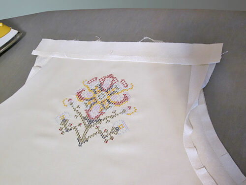 - The bottom of the facing will extend beyond the main apron panel. Fold back this excess amount to create a tiny him.