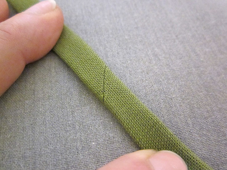 - Fold again along the original crease line, concealing the raw edges within the folds. Those folded edges should be flush and the finished width of the tie should be ½”. Both ends are raw.