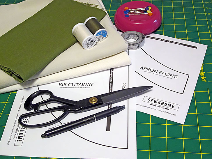 Using the facing pattern, cut TWO for the armhole facings - From the fabric for the apron ties (the green linen blend in our sample), cut THREE 1½” wide x 48” strips