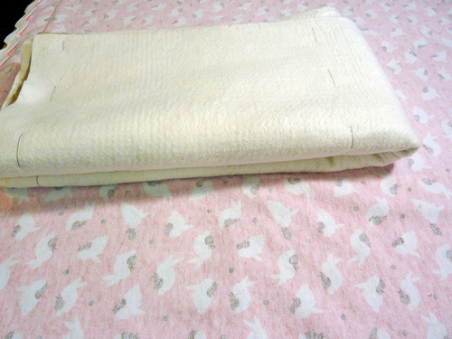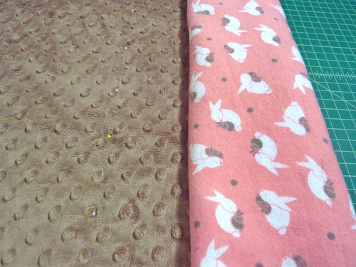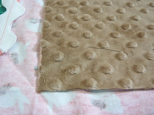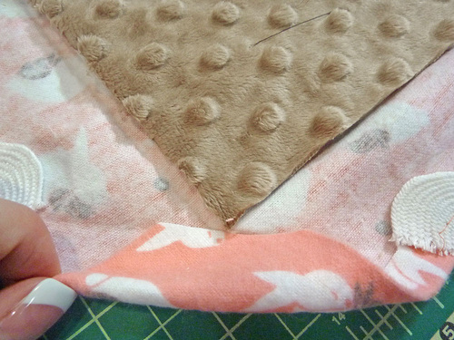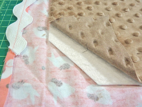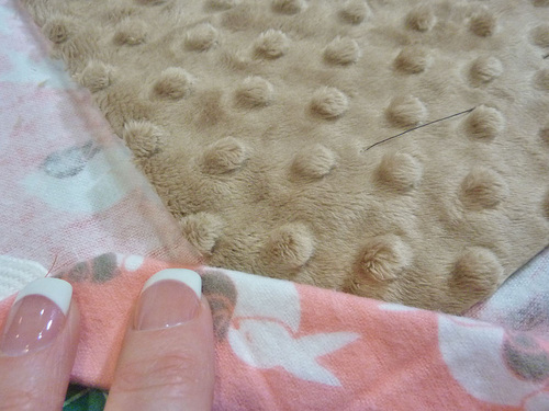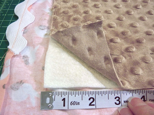 - With the three layers quilted together, lay the blanket right side up (embossed plush side up) on your work surface.
