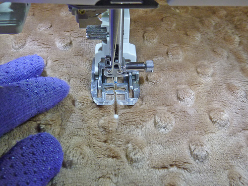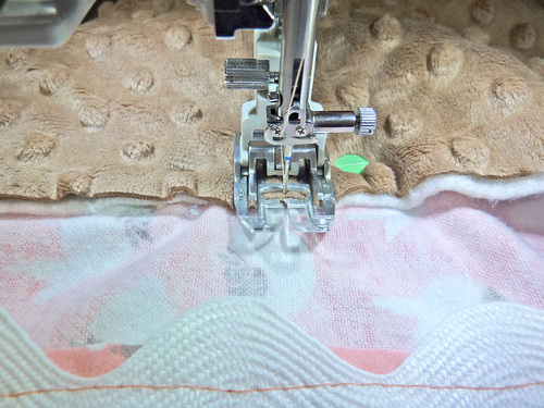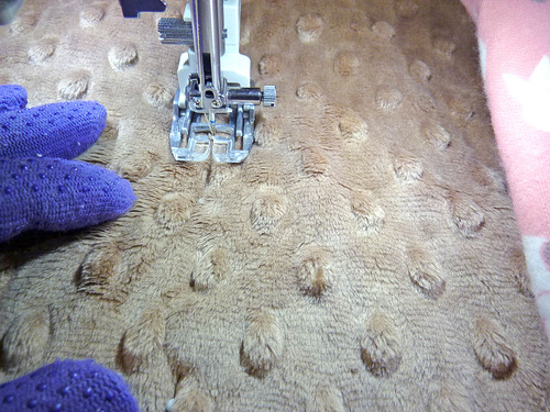 - Attach an Even Feed/Walking foot or engage your machine’s built-in fabric feeding system. Thread the machine with thread to best match the embossed plush in the top and to best match the flannel in the bobbin. Lengthen the stitch to 4mm. And, as an added help, put on quilting gloves to help move the layers through the machine.