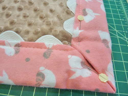 - Fold in the flannel at the corner to test that it covers the raw edge of the rick rack prior to trimming.