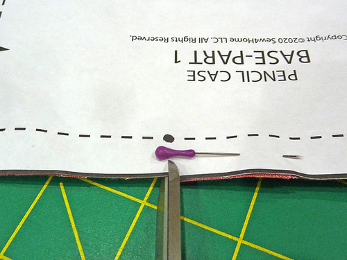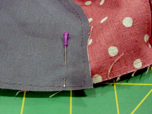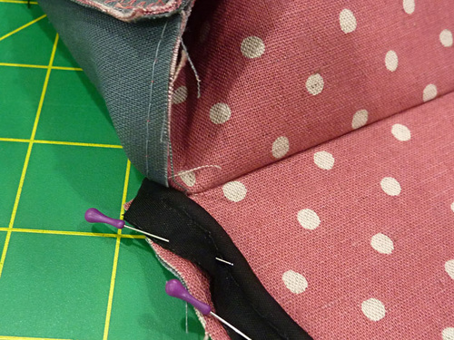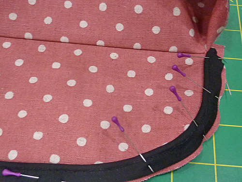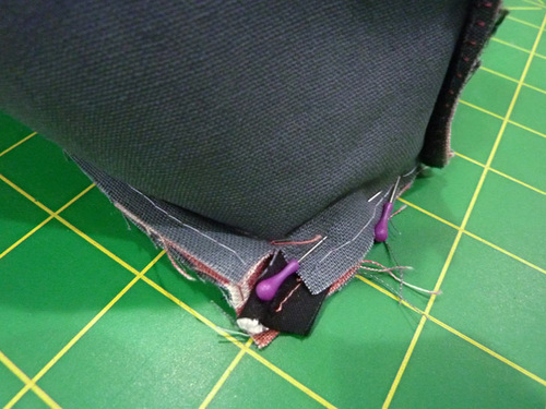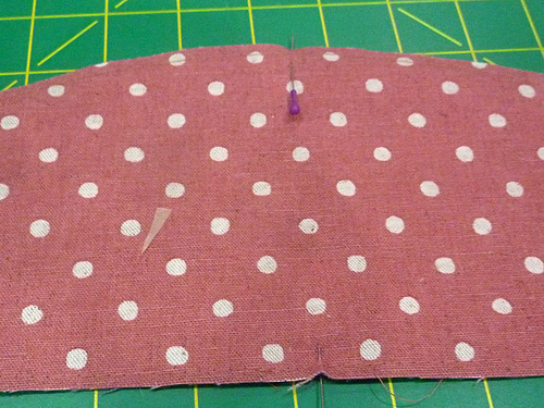 - Bring the front/back panel up into position, pinning it right sides together with the remaining arc of the side loop. In order to allow the panel to fold up more easily, clip into each bottom corner – in the center of that ½” you left free. You are clipping in about ⅜”.