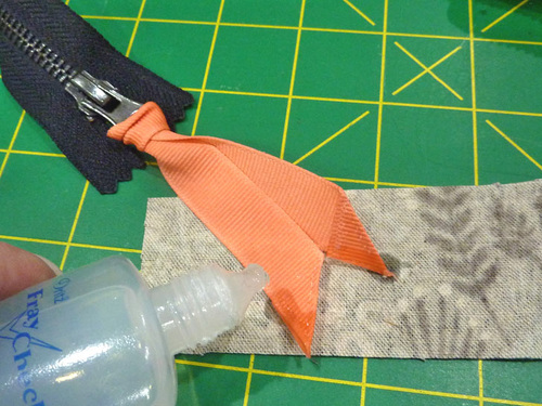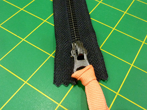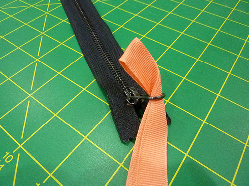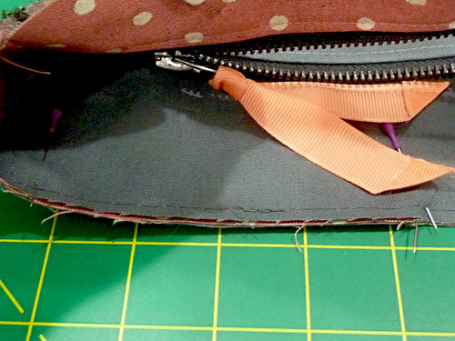 @Kathleen Ann – We show the steps in our order because unless the opening in the zipper pull is unually large, the folded and stitched ends won’t fit through the opening after being stitched. That’s why we suggested doing it as the first thing. And, as shown in the photos, the ribbon isn’t really in the way as you move through the construction process. That said… as always, you’re welcome to switch up the steps in any way you’d like.