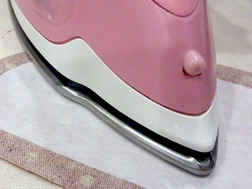 - Place a layer of fusible interfacing on the wrong side of each exterior fabric panel. The interfacing should be centered so there is ½” of fabric showing beyond the interfacing on all sides. Following manufacturer’s instructions, fuse in place.