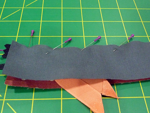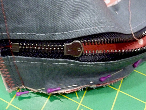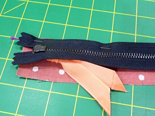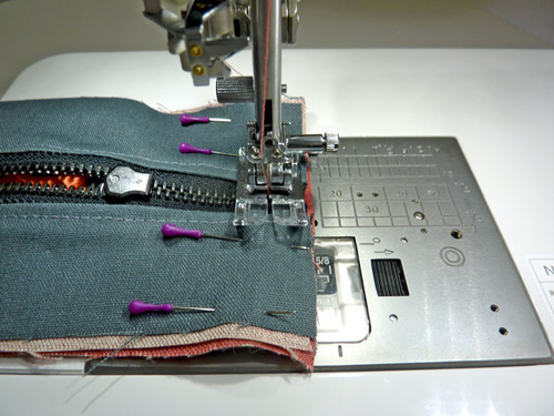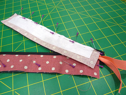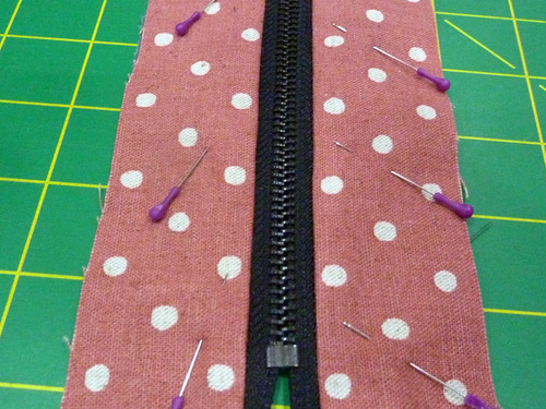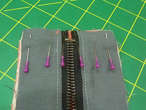 - Press the layers very flat to either side of the zipper and lightly pin them together.