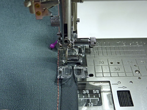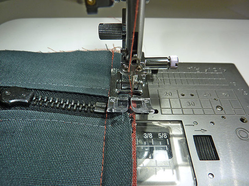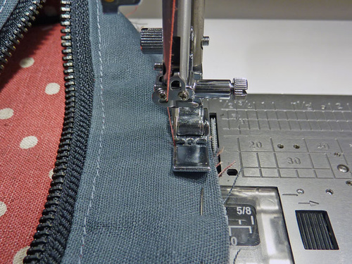 - Still using a Zipper foot, edgestitch through all the layers, staying very close to the seam line to either side of the zipper.