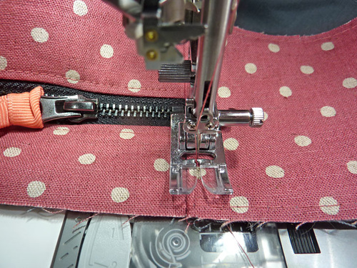 NOTE: As noted, the zipper should be about half way open. Stitch to the middle, where you can start to feel you’re approaching the zipper pull. Stop with your needle in the down position. Lift up the presser foot, twist your fabric around slightly and carefully close the zipper, moving the pull out of the way. Re-position, drop the foot, and finish sewing to the end.