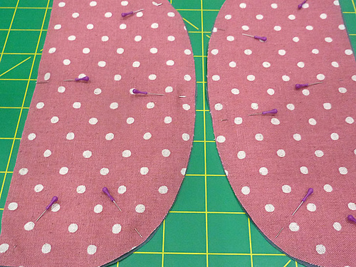 - Find the exterior front and back sections, which should already have their layers of interfacing fused in place, and the front and back lining sections, which are un-fused. Place the layers wrong sides together. Pin together around the perimeter.