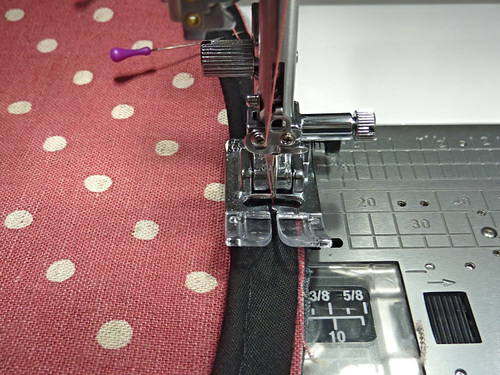 - Fold back the tail of the binding and overlap the head for a clean finish. Pin in place. Still using a Zipper foot, stitch the bias binding to the seam allowance. Remember, you are stitching only through the seam allowance; do not stitch onto the main pouch itself.