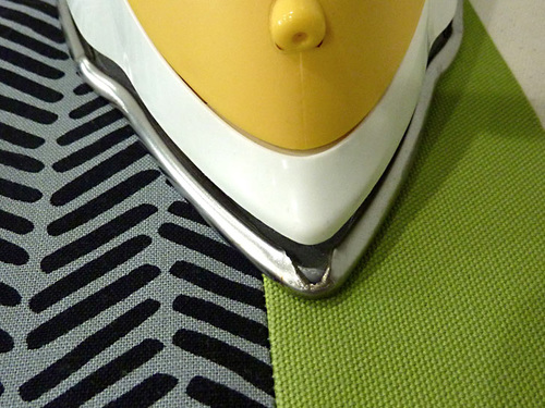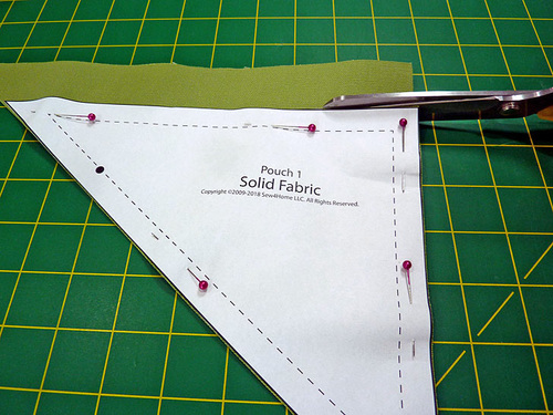 The solid green canvas we chose as the “continuity fabric” across our trio was quite stable and so didn’t need any additional support. Therefore, on our samples, we opted to interface only the coordinating fabrics on each pouch. Depending on the weight of your fabrics, you may need to add the lightweight fusible interfacing to one or both pieces of your exterior panels.